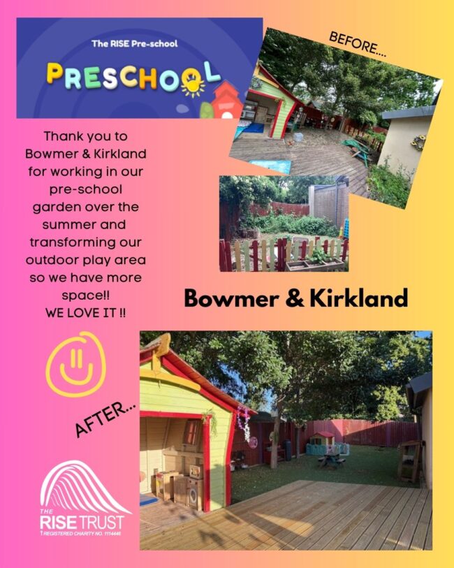 The RISE has been blessed with so many gifts, donations, funding and volunteer time over the summer… The preschool children have come back to a wonderfully revamped outdoor area ready for messy play, mud kitchens and acorn collecting!! All down to the generosity of Bowmer and Kirkland who are currently constructing the new Siemen’s site…